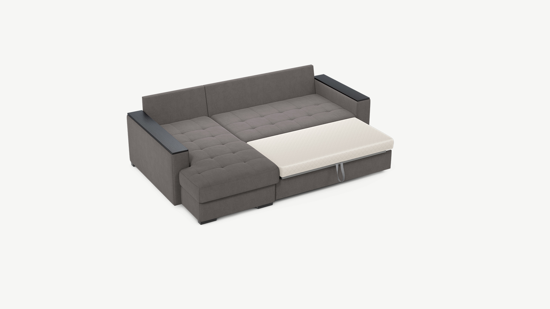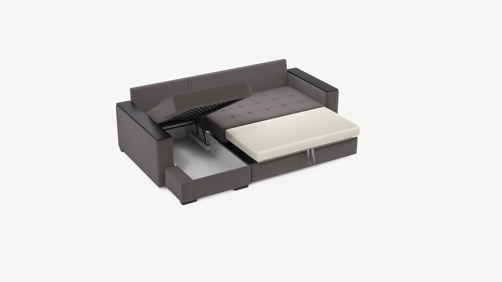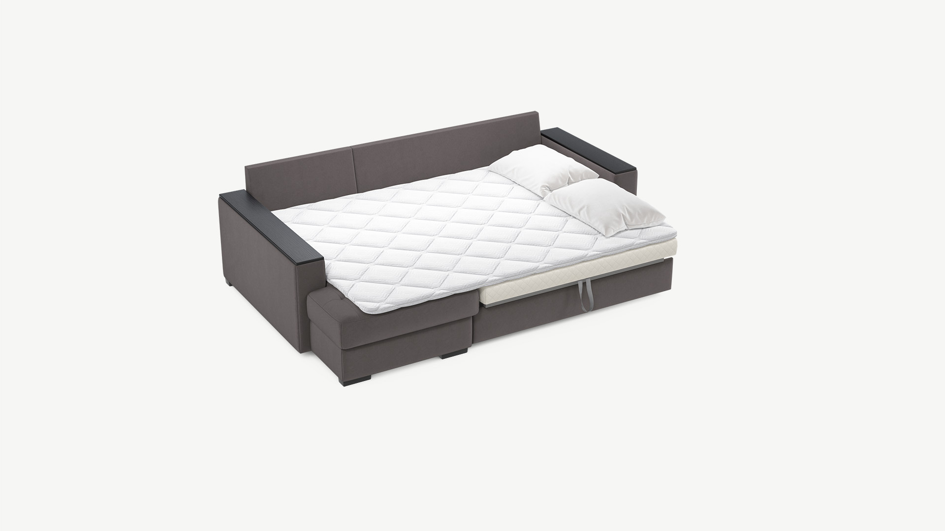 Механизм трансформации «Дельфин» подходит для ежедневного использования. Выкатная секция выполнена в специальной технической ткани, поэтому даже в разобранном виде диван выглядит эстетично и аккуратно.