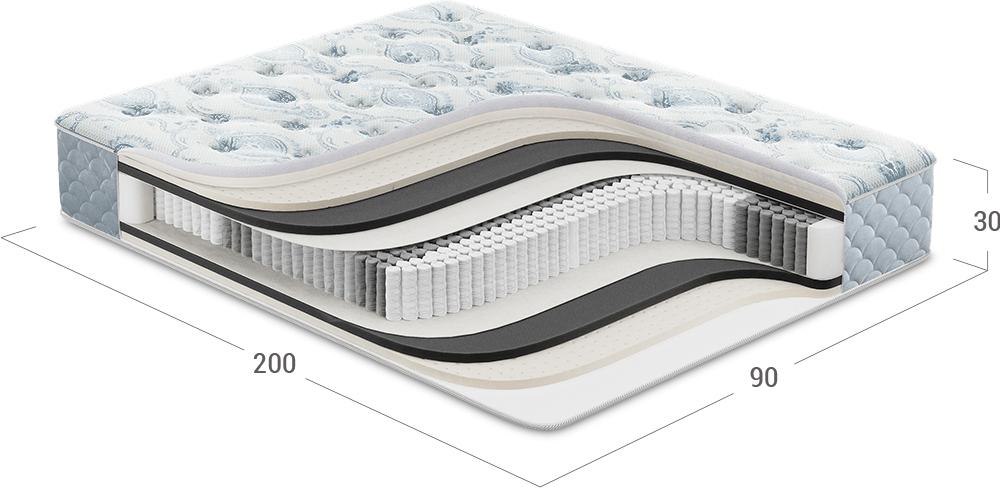 Обеспечивает естественный воздухообмен и сохраняет форму матраса. Выполнен из плотного трикотажа, простеганного на слое упругой пены и искусственного объемного волокна. Точечная стежка поддерживает превосходный уровень комфорта и не позволяет наполнителю смещаться в процессе эксплуатации.