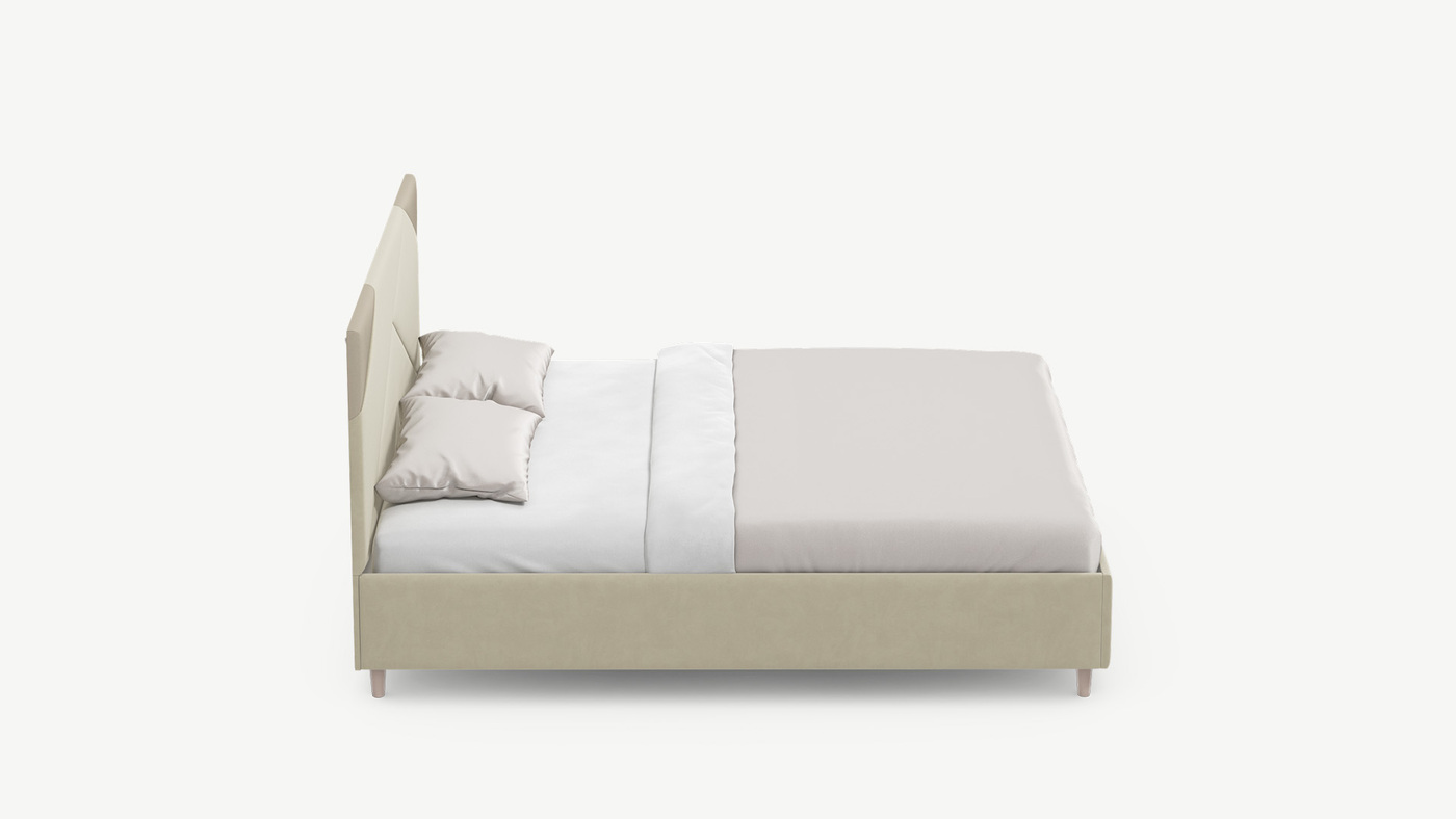 Элегантным и практичным акцентом служат скрытые карманы, расположенные по его углам. Лаконичные формы объемных царг создают единый гармоничный образ и фокусируют внимание на центральном текстурном элементе кровати.