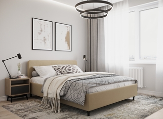 Царга, задающая пропорции, благодаря гладкости своей фактуры подчеркивает центральный элемент декора. Высокие опоры приподнимают фигуру кровати над полом и добавляют её образу визуальной легкости.