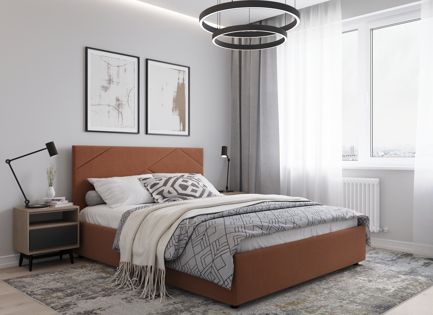 MOON FAMILY 1257 привлекает внимание оригинальным исполнением: широкие полосы ткани эффектно пересекают периметр изголовья, создавая на нем графический орнамент. Элегантным и практичным акцентом служат скрытые карманы, расположенные по его углам. Лаконичные формы объемных царг создают единый гармоничный образ и фокусируют внимание на центральном текстурном элементе кровати.