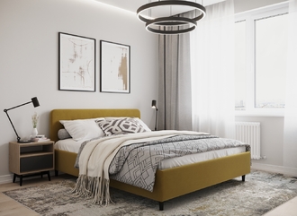Царга, задающая пропорции, благодаря гладкости своей фактуры подчеркивает центральный элемент декора. Высокие опоры приподнимают фигуру кровати над полом и добавляют её образу визуальной легкости.