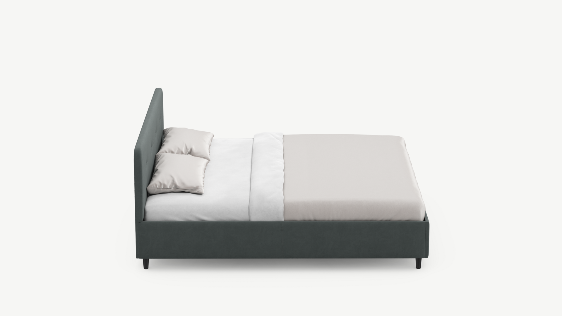 Царга, задающая пропорции, благодаря гладкости своей фактуры подчеркивает центральный элемент декора. Высокие опоры приподнимают фигуру кровати над полом и добавляют её образу визуальной легкости.