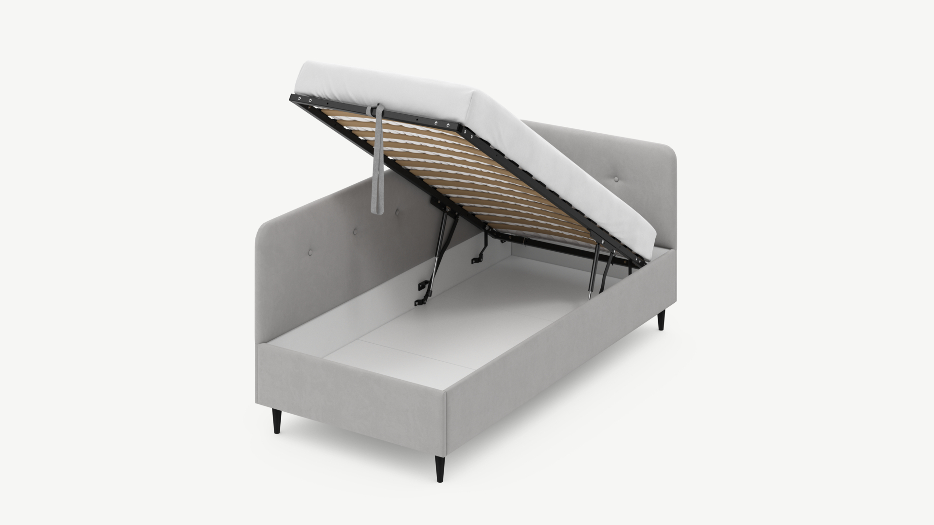 • Регулируемый подъемный механизм имеет два положения установки газовых амортизаторов в зависимости от веса матраса. Это дает возможность оптимально подстраивать угол подъема основания, а также плавно и бесшумно поднимать и опускать спальное место.