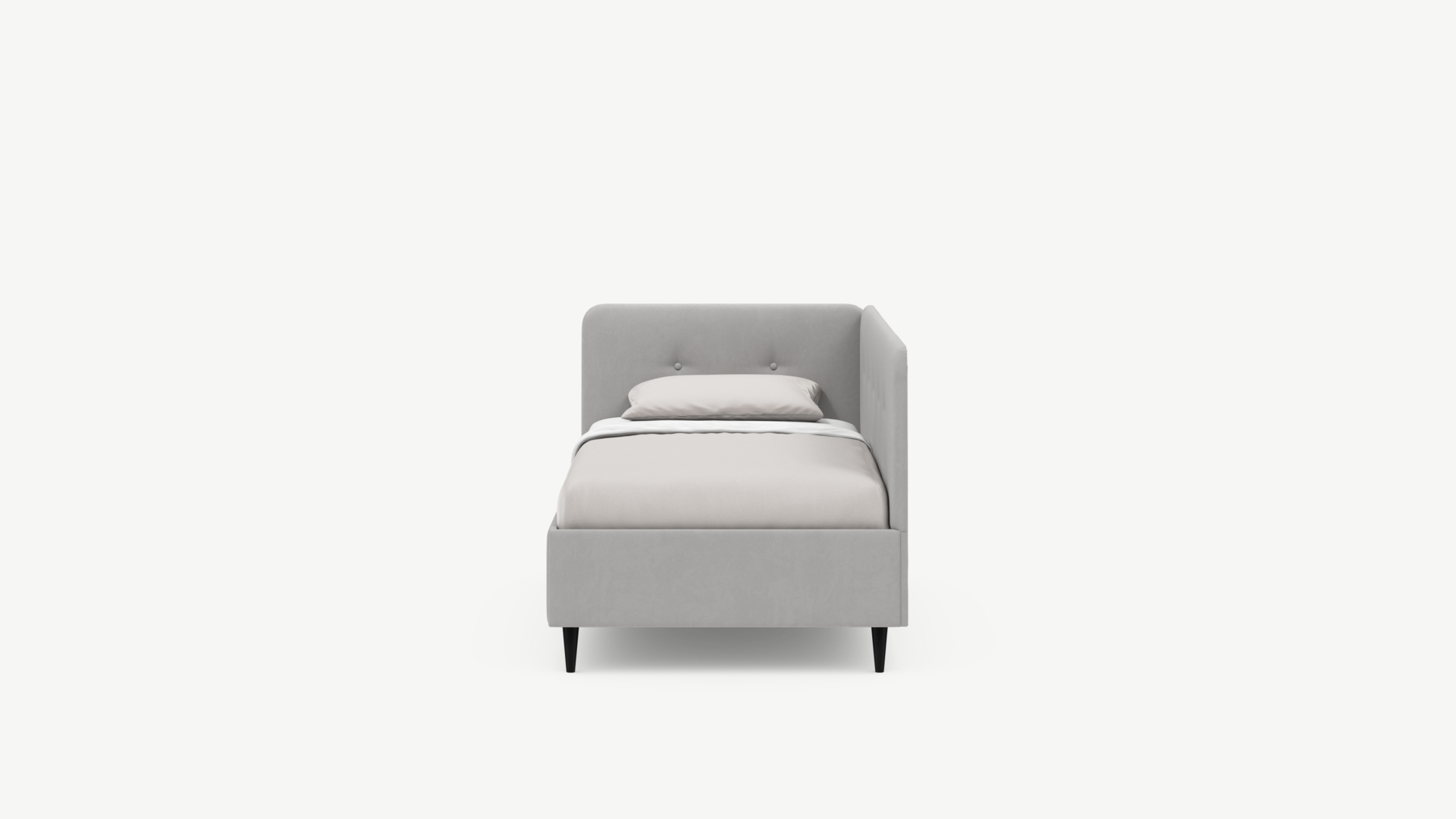 Угловая односпальная кровать MOON FAMILY 1253 с мягкой спинкой и изголовьем обладает округлыми формами, привносящими в интерьер нотки нежности. Изголовье, украшенное пуговицами, добавляет окружающему пространству шарм и уют. Высокие опоры придают кровати визуальной легкости, а также обеспечивают удобство во время уборки.