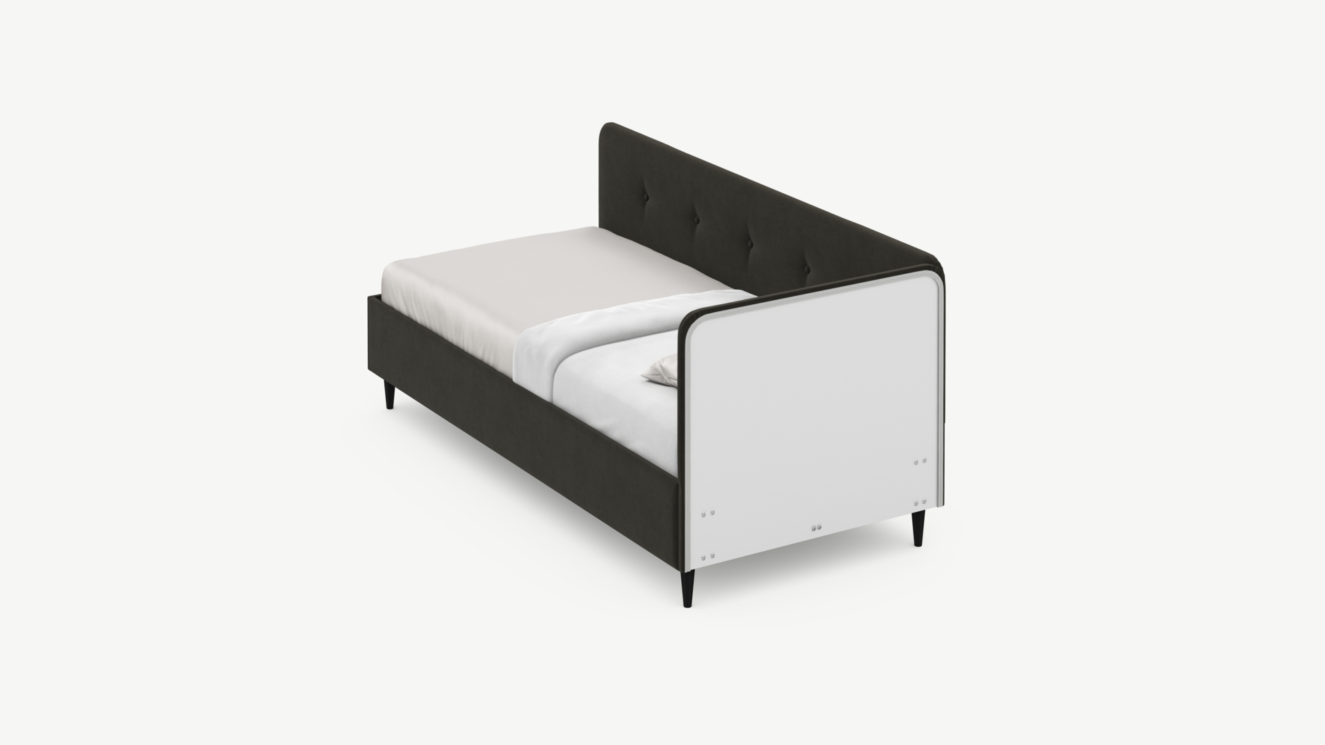 Угловая односпальная кровать MOON FAMILY 1253 с мягкой спинкой и изголовьем обладает округлыми формами, привносящими в интерьер нотки нежности. Изголовье, украшенное пуговицами, добавляет окружающему пространству шарм и уют. Высокие опоры придают кровати визуальной легкости, а также обеспечивают удобство во время уборки.