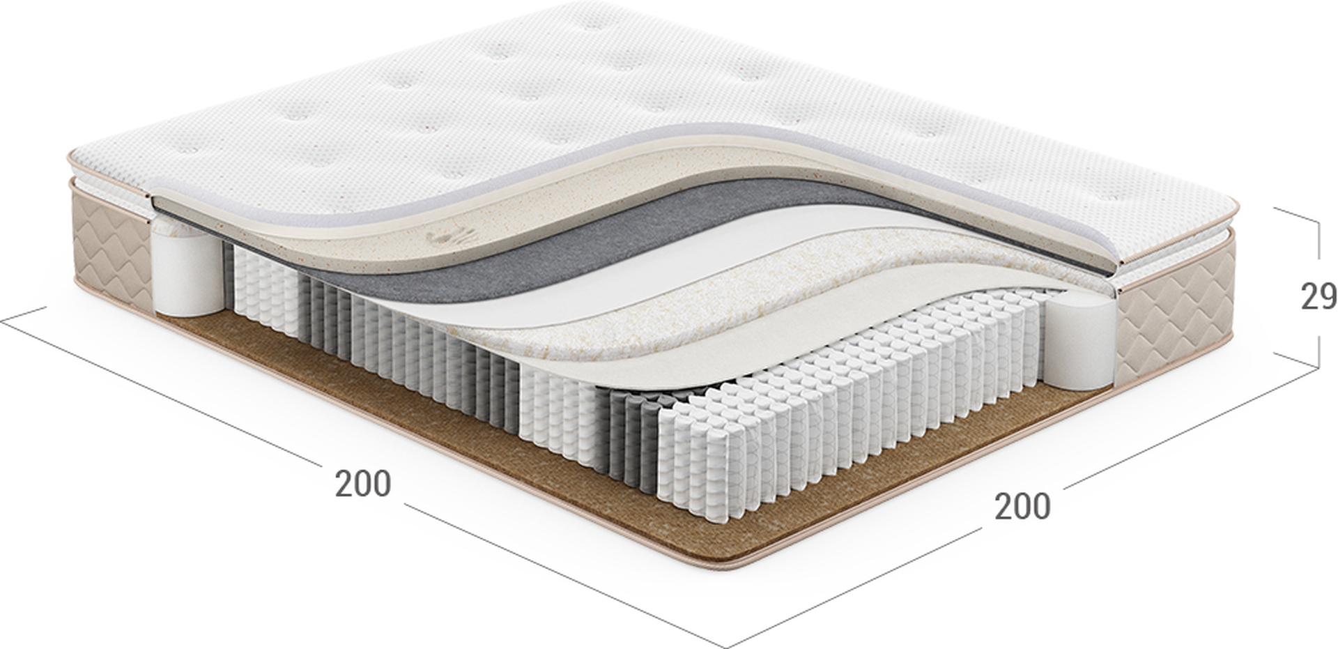 Надежно изолирует комфортные слои от соприкосновения с пружинным блоком и защищает материалы наполнения матраса от износа.